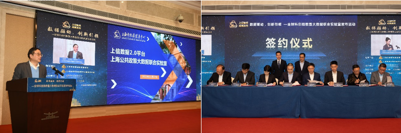 在发布活动上,由市经济信息中心与相关合作单位共建的公共政策大数据联合实验室成立签约仪式成功举行。市经济信息中心主任余文凯和中国信息通信研究院华东分院院长廖运发共同见证。公共政策大数据联合实验室将在数据资源、模型构建、技术开发和政策研究等方面发挥各方优势,联合开展相关领域的应用性和前瞻性课题研究,为政府部门提供决策支持。首批合作单位包括中国出口信用保险公司上海分公司、上海银联商务有限公司、中国电信股份有限公司上海分公司、前锦网络信息技术(上海)有限公司、商安信(上海)征信有限公司、北京融信数联科技有限公司和上海众恒智能系统技术有限公司等。