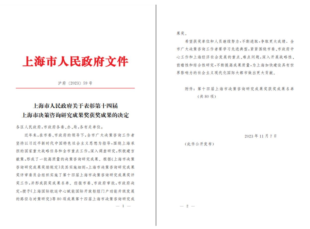 近日,第十四届上海市决策咨询研究成果奖获奖名单正式公布。中心共有3项成果获奖,其中,余文凯主任牵头的《上海市经济社会全面绿色转型中长期战略研究》、叶东晖副主任牵头的《上海壮大产业经济新动能,强化新赛道布局研究》荣获二等奖,李如心副主任牵头的《对标全球主要科创城市,加快上海科创中心建设对策研究》荣获三等奖。