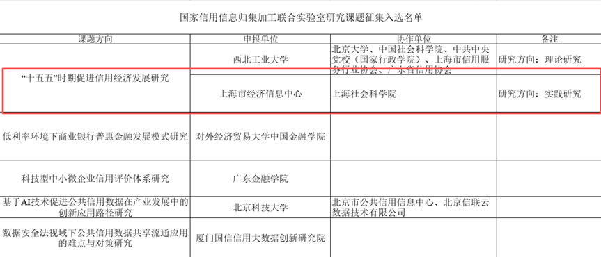 近期,国家信用信息归集加工联合实验室研究课题征集入选公告公开发布,上海市经济信息中心(上海市公共信用信息服务中心)牵头的“十五五”时期促进信用经济发展研究课题成功入选。